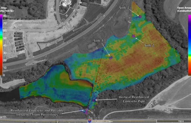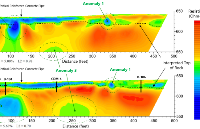 The geophysical surveys indicated potential karst voids and fractured bedrock, some of which were not captured in test borings. Using these indicated geophysical anomalies, CDM Smith could target areas where those features could threaten the stability of the future rehabilitated dam if left untreated.