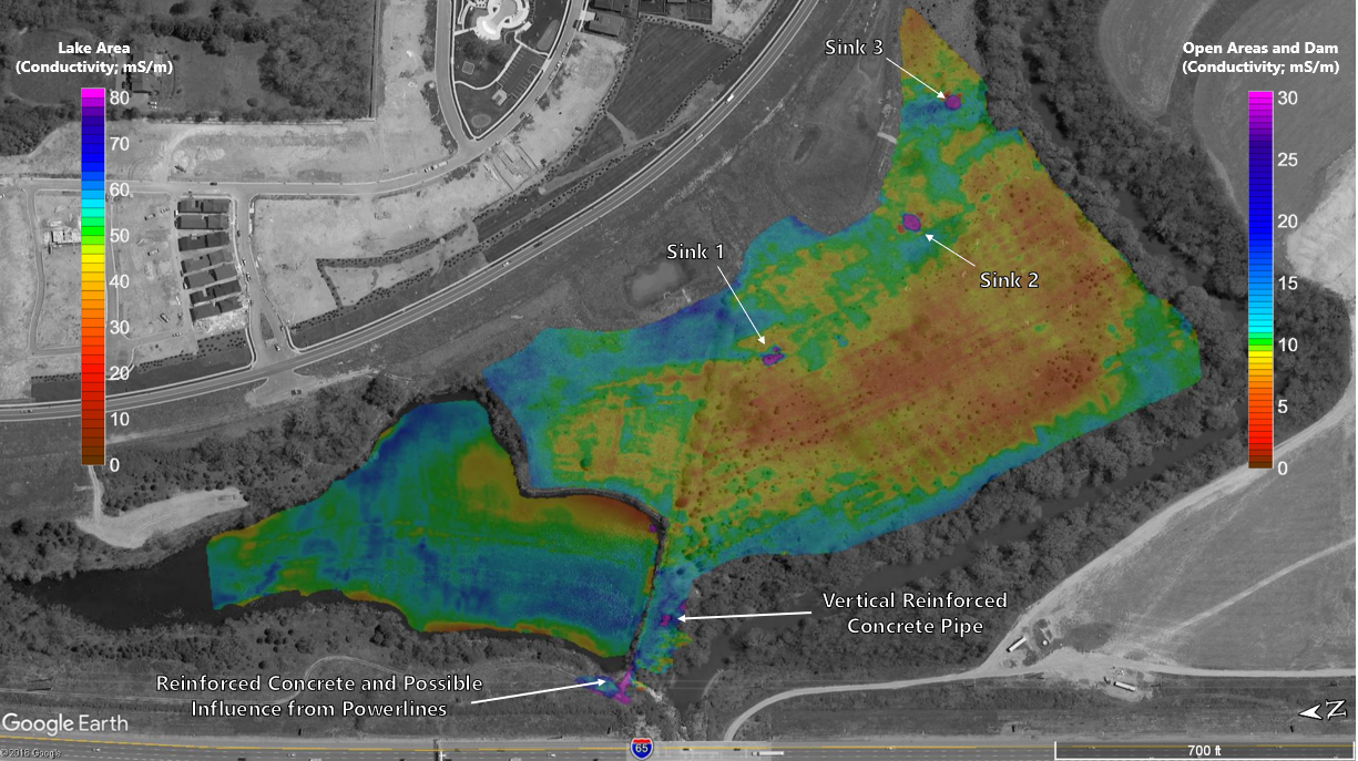 S&ME’s Geophysical team completed a combination of Frequency Domain Electromagnetics (FDEM), Electrical Resistivity Tomography (ERT), and Spontaneous Potential (SP) surveys within the accessible portions of the site and overtop the lake to acquire additional subsurface information to assist CDM Smith’s evaluations related to seepage and possible karst risk.