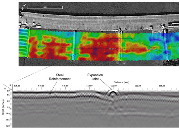S&ME provided nondestructive testing services using the ground penetrating radar (GPR) method for Gallant’s Channel Bridge in Beaufort, NC. A high-speed air-coupled GPR system with a GPS for positioning support was used along a total of about 6.5 linear miles of bridge deck to determine steel reinforcement concrete cover thickness across the newly constructed structure. S&ME presented the results to the client via a color-coded data plot and project stationing to use for construction quality control and compliance with NCDOT specifications.