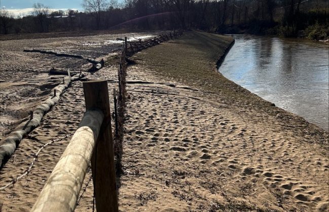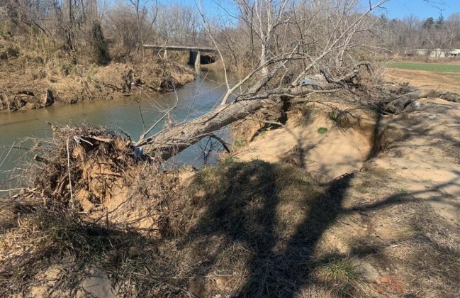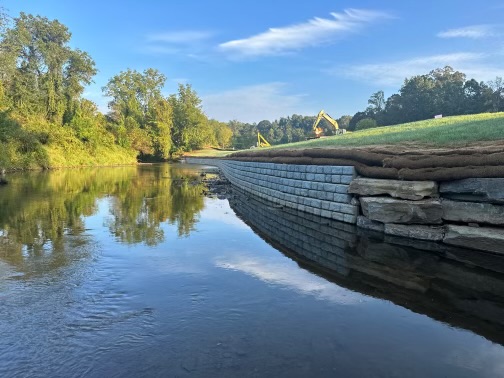 The project entails the stabilization of two linear sections of Hominy Creek near Asheville, Buncombe County, North Carolina. The erosion along the banks of the creek encroached on the Dominion Energy NC natural gas easement and had the potential to expose the T-072 gas transmission line, which runs parallel to the creek. Each section of repair encompassed approximately 225 to 250 linear feet of the creek bank and included hard armoring with redi-rock and natural boulders. Soft armoring utilizing bio-D blocks was also incorporated into the bank stabilization design.
