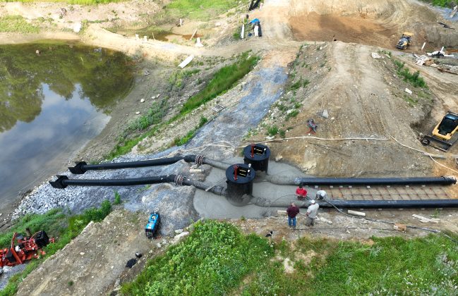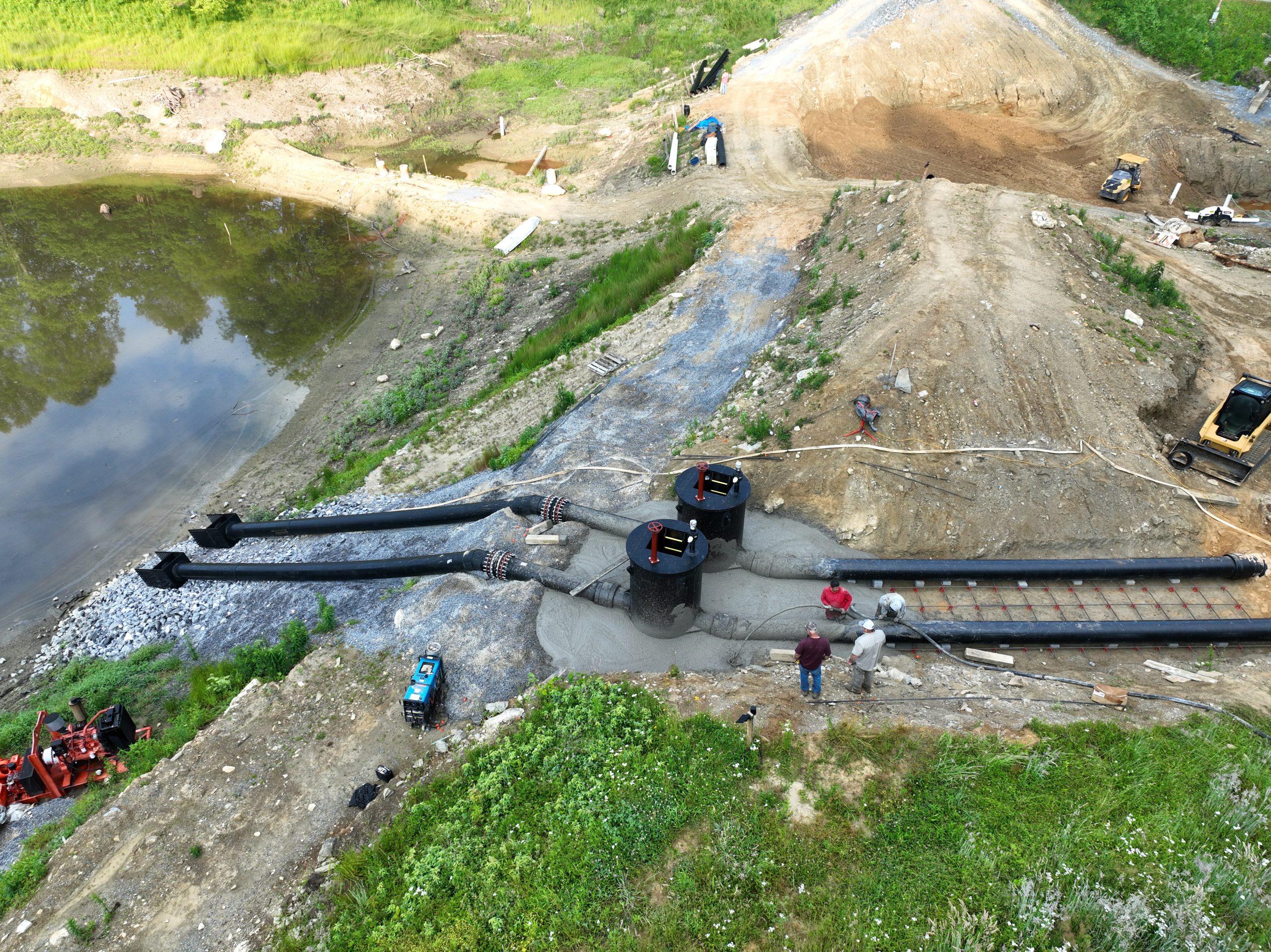 When the embankment filling was approximately 10 feet below the crest, Hurricane Helene deposited approximately 15 inches of rainfall at the site over 2 days. The storm flow was passed using the two new 20-inch siphon drains, pumps, and a temporary spillway notch without overtopping the dam.