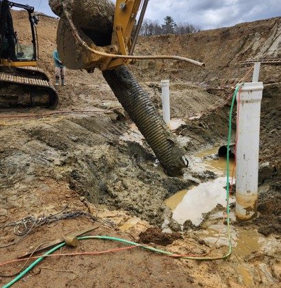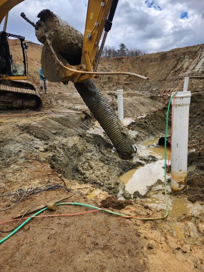 The geotechnical evaluation and research indicated the dam core was constructed using semi-hydraulic fill methods. An original CMP outlet was also through the dam. The repair design included two new 20-inch siphon drains; widening the dam crest 5 feet; construction of a chimney, blanket, and toe drain; and construction of an earthen stability berm. S&ME provided CQA observation and testing services for the project. During lake drawdown, a surface depression was observed on the upstream slope indicating the potential for internal erosion along the CMP, and removal of a section of the embankment and CMP was performed and inspected. It was found that the CMP had been grouted in place. Excavated embankment soils were replaced with compacted, off-site borrow materials. The upstream depression area was excavated and grouted.